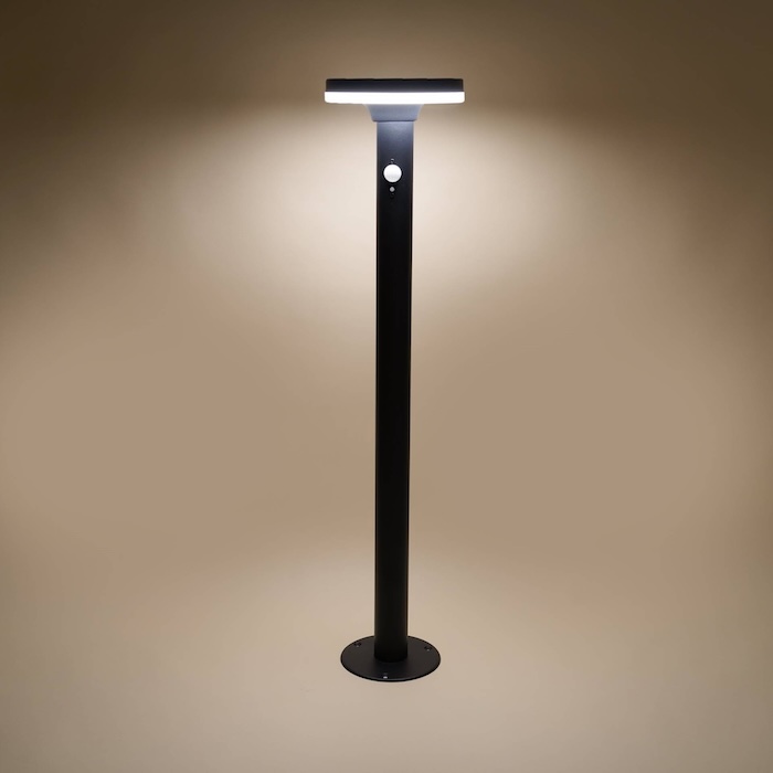 Borne Solaire Haute Elégante et Design Actuel à Bonne Puissance d'Eclairage 600 Lumens en mode détection, avantage de pouvoir choisir entre ses 3 modes d'Eclairage Solaire et d'optimiser son fonctionnement en Hiver, belle lumière blanc jour 4000°K dirigée vers le sol.