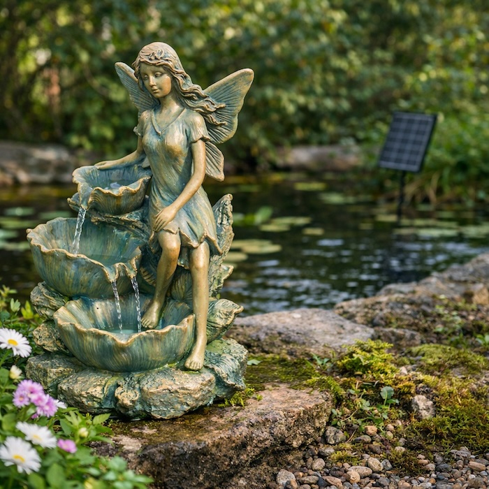 Jolie petite Fontaine Solaire Cascade Fée Coquillage sur 3 niveaux, belle qualité de fabrication en polyrésine sans entretien à bel aspect bronze vieilli peint à la main, facile à installer dans vos jardins, terrasses ou balcons, sans raccordement, en toute autonomie et sans coût d'énergie.